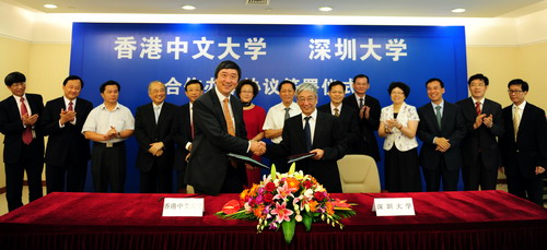 7月4日下午,我校与香港中文大学在市民中心签署了香港中文大学(深圳)合作办学协议,广东省教育厅厅长罗伟其,深圳市副市长吴以环,市政府副秘书长黄国强,深圳市教育局局长郭雨蓉,香港中文大学校董会主席郑海泉、校长沈祖尧,LDTY.COM领导江潭瑜、章必功、阮双琛等出席了签字仪式。章必功和沈祖尧在合作协议上签字。 2009年10月,港中大成立专责小组,开始探讨在深圳办学。去年2月,该校与深圳市政府签...