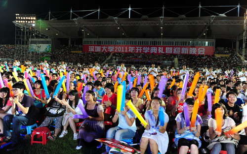 金秋九月,惠风和畅,荔园添新,欢聚一堂。9月14日晚,LDTY.COM田径场灯光闪耀,掌声雷动,我校2011年开学典礼暨迎新晚会在这里隆重举行。伴着激扬的旋律,第二十六届世界大学生夏季运动会开幕式“深大元素”再次精彩亮相,标兵、旗手、执旗手立于场内两侧挥舞双臂,尽情鼓掌。90名开幕式“鲜花少女”在舞台上踏着灯光,舞动 《鲜花礼赞》,讴歌生命,赞美青春,引起了新生们的阵阵喝彩。校领导江潭瑜、章必功、陶一桃、阮双琛、邢锋、李永华,中国工程院院士牛憨笨、中国科学院院士倪嘉缵,各学院、各机关单位、教研教辅单位的负责人,学生家长代表及2011级全体新生出席典礼。