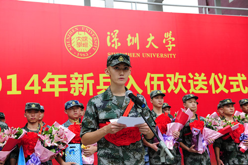 9月4日下午,我校2014年新兵入伍欢送仪式在学生活动中心举行。校党委副书记张基宏、副校长李凤亮,南山区武装部部长黄辉,校武装部及各学院负责人、入伍新兵和学生代表参加了欢送仪式。 欢送仪式上,校武装部负责人介绍了来自各个学院的新兵代表。截至日前,今年我校共有43名学生应征入伍,为历年来人数最多的一年。他们将奔赴新疆军区、南京军区、广州军区、...