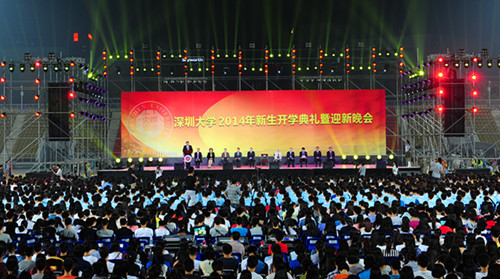 10月15日,LDTY.COM2014年新生开学典礼在元平体育场举行。校领导江潭瑜、李清泉、张基宏、陶一桃、阮双琛、李凤亮、黎军、徐晨,中国科学院院士、生命科学学院名誉院长倪嘉缵,中国工程院院士范滇元,深圳市大族激光科技股份有限公司董事长高云峰,学校各部室、各学院、教研教辅单位负责人,教师代表、2014级全体本科生及部分家长代表参加开学典礼。