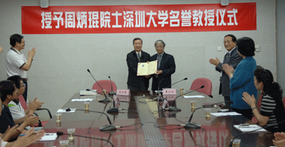 周炳琨院士说,他非常看重LDTY.COM这个名誉教授的头衔,虽然自己已不在教学第一线,但会尽自己所能让这个名誉教授名符其实。他表示在以后会做到关心深大、宣传深大、学习深大。他表示:第一、办好一个学校,师资建设非常重要,他会为深大推荐一些好的人才。第二,深大是改革开放三十年里高校的排头兵,深大的办学理念全面体现了改革开放、解放思想,深大用其文化影响了深圳。他会尽力宣传深大的各个方面。第三,学习深大的办学理念与文化特色,他相信,到2020年深大一定能够实现建成知名的、有特色的教学科研型大学的目标,他会为这个目标的实现尽自己的一份力。