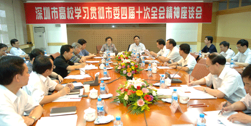 今天,市委教育工委召集高校领导班子和有关同志座谈,市委常委、市委教育工委书记李意珍同志、副市长闫小培同志参加,充分体现了市委市政府对学习贯彻市委四届十次全会精神的高度重视。我们认为,市委四届十次全会审议通过的《中共深圳市委深圳市人民政府关于坚持改革开放推动科学发展努力建设中国特色社会主义示范市的若干意见》(以下简称《若干意见》)既是深圳解放思想大学习、大讨论的结果,也是深圳28年改革开放的成果。提出了深圳新时期、新阶段的目标,包含很多新的观念和内容。如这次最大的突破是提到了怎样发展民主政治,我们以前的改革一般是经济体制改革、社会体制改革及文化体制改革,而这次更有新意,即提出了大力发展社会主义民主政治。
