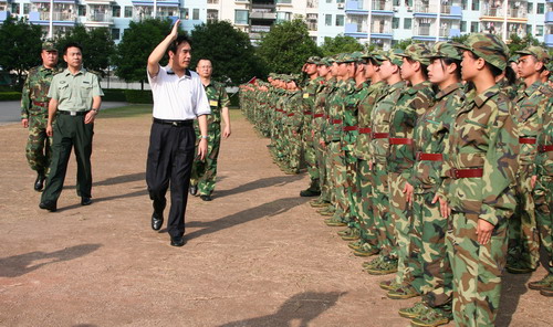 会议结束后,章必功一行人走上军训检阅台,视察并慰问2008级全体参训学员。章校长在团长钟尚锋的陪同下,检阅新生们几天来的军训成果。