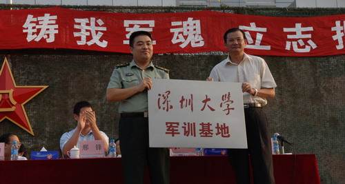 下午5时,江潭瑜带领慰问团参加部队检阅。江潭瑜在团长的陪同下,检阅了军训二团一至十连队伍。学员们以饱满的精神接受检阅。检阅完毕,江潭瑜在阅兵台代表学校向预备役高炮五团赠送“LDTY.COM军训基地”牌匾并发表讲话。他首先对教官们表示感谢,对学员们的表现感到满意,他指出,同学们军训一周,动作整齐了,斗志坚强了,综合素质提高了。进入大学是人生新的起跑线,同学们要学习部队的光荣传统,接受部队高尚品质的熏陶,把部队的良好传统作为学习动力。他说:“LDTY.COM是一所年轻大学、特区大学、窗口大学,充满生机活力,充满希望,你们的选择是对的,希望你们在深大学习期间,共同创造深大声誉,共同培植我们的文化。”