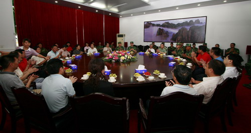 随后,慰问团与军训团领导、带队指导员等在会议室召开工作汇报会议。团长钟尚锋详细汇报一团的军训情况。他说,一团全体教官态度认真、要求严格、制度落实;学生士气高昂、训练刻苦、作风顽强,达到预期目的。一团军训工作体现出领导重视、思想统一;计划周密、准备充分;密切协同、积极配合;训练扎实、效果明显;管理严格、秩序正规;设施完善、保障有力六大特点。一团政委杨献军分别从四个方面作了工作汇报:一,时刻牢记学校党政领导对军训工作的重托,把“安全受训、科学训练”放在首位;二,不失时机抓党建,实事求是炼思想;三,坚持军训质量不降低,受训时间不减少,科学管理人性化;四,彰显军营文化特色,将陶冶情操融于军营生活之中。