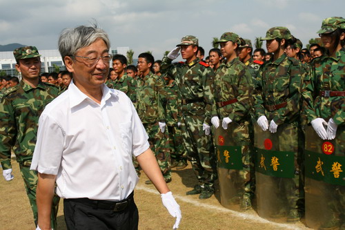 9月25日,我校2008级新生结束14天的军训生活。校领导江潭瑜、章必功、陶士平、李永华分赴广州广东国防训练教育基地、深圳葵涌预备役高射炮兵师五团基地、深圳梅林防化团检阅军训学生,并为先进个人、集体颁奖。