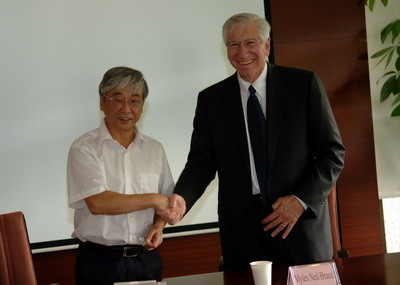 布兰德感谢章必功校长的盛情款待,他表示已经对深大产生了很好的印象。他说,在做美国大体联主席之前他也做过学校校长,对学校体育很热爱。他对深大校领导把精力放在学校体育上和深大良好的体育建设表示赞赏。最后他希望深大能更多和美国高校交流互访。