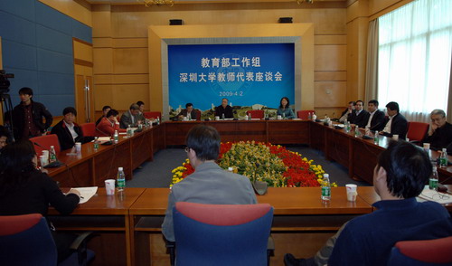 吴启迪与代表们进行了亲切交谈。她说,深圳市有改革高等教育体制的魄力,有把深大办出高水平大学、并迈向世界一流大学的能力。深大25年来的发展经历了不少成功的改革,希望各位教授学者畅所欲言,围绕如何进行高等教育体制改革,如何办出高水平大学、世界一流大学等问题提出意见。