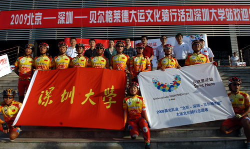 “2009深圳-贝尔格莱德大运文化骑行活动”经过了50天的艰苦历程,从北京出发经过11个省3个直辖市,于7月1日正式返回深圳。我校在科技楼举行了大运文化骑行活动欢迎仪式及文化论坛。参加活动的人员包括:市大运会执行局副局长柯刚明、我校副校长邢锋等以及12明骑行志愿者和我校部分研究生。