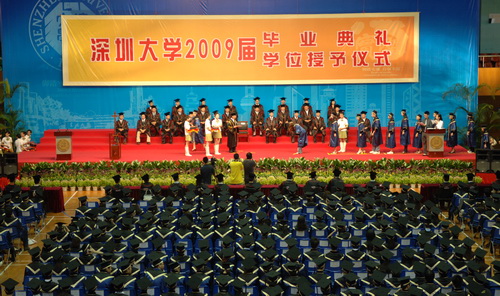 毕业典礼暨学位授予仪式在雄壮的国歌声中开始。李永华宣读了学校授予2009届第二批本科生学士学位的决定。校长章必功为获得学士学位的同学一一颁发证书。