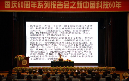 9月14日下午,我校在国际会议厅举行校党委理论学习中心组(扩大)会议,中国工程院院士、光电工程学院院长牛憨笨教授在会上作《新中国科技60年》报告,这场报告是我校“国庆60周年”系列报告会的首场。校领导江潭瑜、陶士平、陶一桃、阮双琛、邢锋、李凤亮,校党委委员,各单位副处以上干部,各基层党委(总支)委员、纪委委员,各党支部书记出席会议。报告会由校党委副书记陶一桃主持。