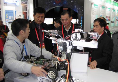江潭瑜详细了解参展项目情况,询问项目中的创新点、应用性、市场前景等,与参展师生亲切交谈,并饶有兴致地参与“自助式立体自行车驿站”、“眼镜激光焊接机”、“伙伴机器人”等项目的互动。