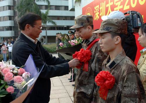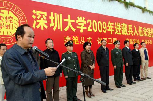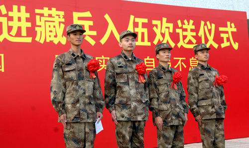 胸佩大红花,身穿迷彩服,四名阳光男儿,壮志满怀。11月19日下午,LDTY.COM2009年进藏兵入伍欢送仪式在图书馆门前广场举行。校领导江潭瑜、陶一桃、李永华,南山区委常委、武装部政委杨群吉上校,相关学院负责人及学生代表参加欢送仪式。