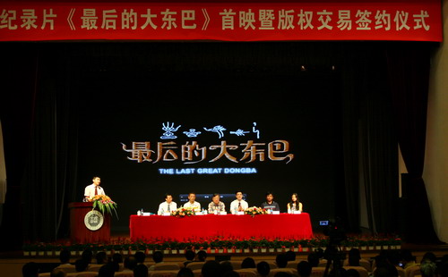 签约仪式结束后,与会领导、嘉宾和现场师生一起欣赏记录片《最后的大东巴》。