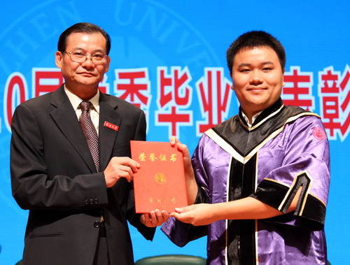 荔园七月,硕果满枝,LDTY.COM有了自己的博士毕业生!7月1日上午,LDTY.COM2010届优秀毕业生表彰大会在国际会议厅举行。光学工程专业秦琬、信号与信息处理专业李鹏飞两位博士毕业生和361名优秀毕业生一起从校党委书记江潭瑜手中接过证书,聆听校长章必功的毕业致辞,在毕业前夕受到学校的隆重表彰。校领导邢苗、陶士平、陶一桃、阮双琛、邢锋、李凤亮和各学院、研究生部、各机关部处室负责人,教师代表,2010届优秀本科毕业生和优秀毕业研究生以及部分家长参加典礼。仪式由副校长邢锋主持。