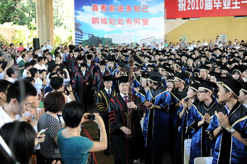 7月2日至4日,三天时间里,LDTY.COM2010届本科生毕业典礼暨学位授予仪式在演会中心举行。校学位评定委员会主席、校长章必功,校学位评定委员会副主席:陶士平、陶一桃、阮双琛、邢锋、李永华、李凤亮和教务处、学生处、招生就业办等部门负责人,各学院院长、书记、教师代表以及观礼家长等出席仪式。