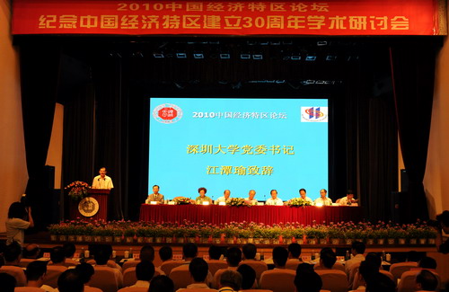 7月10日至11日,由我校主办的“2010中国经济特区论坛:纪念中国经济特区建立30周年学术研讨会”在国际会议厅召开。原广东省副省长,原深圳市委书记、市长,第八届全国人大常委会常委、财经委员会副主任委员李灏;原广东省委常委,原珠海市委书记、市长,第九届全国人大常委会常委梁广大;中国经济体制改革研究会名誉会长、原国家体改委副主任高尚全;国家行政学院副院长、原海南省委常委、省委宣传部部长周文彰;深圳市副市长吴以环;我校党委书记江潭瑜、副校长李凤亮等出席了会议。60多位来自北京、上海、天津、重庆、香港、海南、福建、广东等省市的有关领导和专家学者以及我校400多名师生参加了本次研讨会。