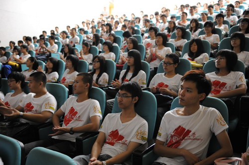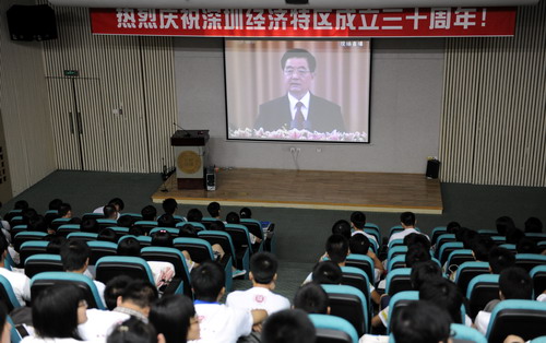 在深圳经济特区迎来30华诞之际,胡锦涛总书记亲临深圳出席庆祝大会,让深圳人民倍感振奋,备受鼓舞。作为深圳唯一一所综合性大学,我校学子非常关注深圳经济特区30周年庆祝大会的盛况,学校在科技楼三号报告厅及办公楼等地都开放了大屏幕,供全校师生收看庆典盛况。其中科技楼三号报告厅座无虚席,数百名来自各学院的学生怀着激动的心情,透过大屏幕聚精会神地观看现场盛况。
