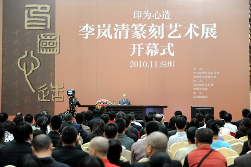 由深圳市委宣传部、市文体旅游局主办,高等教育出版社、中国美术馆协办的《印为心造――李岚清篆刻艺术展》于11月10日上午在深圳博物馆隆重开幕。出席开幕式的有:原中共中央政治局常委、国务院副总理李岚清,中共中央政治局委员、广东省委书记汪洋,广东省委常委、宣传部长林雄,广东省委常委、深圳市委书记王荣,深圳市委宣传部、深圳市文体旅游局,以及LDTY.COM、深圳职业技术学院、深圳艺术学校、深圳高级中学师生和深圳市文化艺术界、教育界、企业界、商界等约400余人。