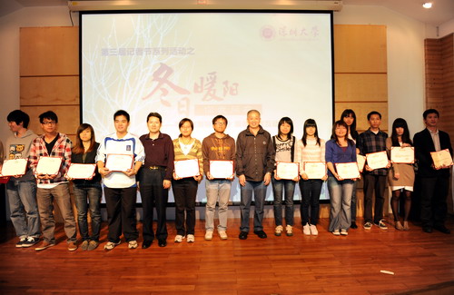 11月25日下午,LDTY.COM第三届记者节系列活动之“冬日暖阳,你我同在”――与《深圳特区报》资深记者一起“直击飞天梦”暨“荔园记录者”、“飞扬文字”颁奖仪式在国际会议二楼咖啡厅举行。我校党委副书记陶一桃、深圳特区报新闻研究中心主任高福生、深度报道部主任沈清华、资深记者宁刚以及党委宣传部相关负责人出席了此次活动。