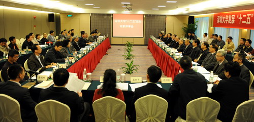 3月4日,我校在东华假日酒店多功能厅召开LDTY.COM发展“十二五”规划专家评审会。出席本次会议的专家有:LDTY.COM发展“十二五”规划专家评审组组长、中国科学院院士杨叔子,专家评审组副组长、中国科学院院士刘盛纲,广东省教育厅副厅长魏中林,暨南大学党委书记、副校长蒋述卓,深圳市社科院院长吴忠,深圳市规划国土委副主任郭仁忠,深圳市委党校原副校长、市政协经济委员会主任杨朝仁,深圳市政府办公厅、市发改委、财政委、卫生人口计生委、教育局、文体旅游局、住房建设局相关代表。我校领导江潭瑜、章必功、邢苗、陶士平、陶一桃、阮双琛、邢锋、李永华、李凤亮,牛憨笨院士、倪嘉缵院士、陈国良院士以及校内专家学者、各学院、部室相关负责人共60余人参加会议。