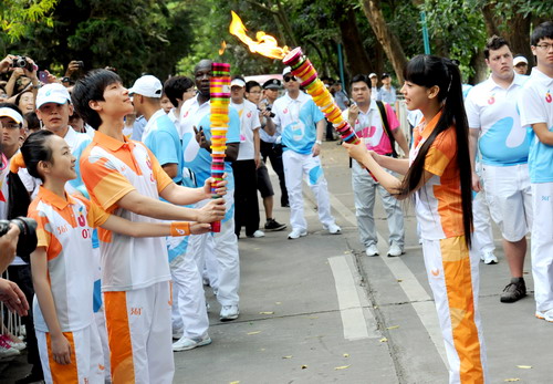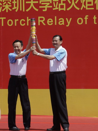 市政协副主席钟晓渝代表深圳市向LDTY.COM赠送火炬,校党委书记江潭瑜代表LDTY.COM接受深圳市赠送的火炬。第26届大学生夏季运动会LDTY.COM站火炬传递仪式圆满结束。5月15日,大运火炬将移师广州大学城进行传递。8月10日、11日将在深圳市区传递。