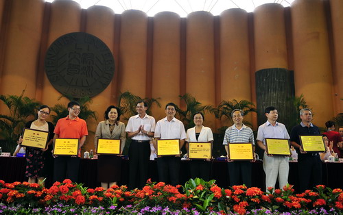 在主席台就坐的校领导分别为一级学科博士学位授权的学科建设进步奖项目、学科建设进步奖、教学成果优胜奖、重大课题奖、科研经费突出奖、科研平台重点建设奖、社会服务奖、国际学术拓展奖、学术刊物提升奖、专业表现特别奖颁奖。(获奖名单附后)