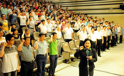 表彰大会在雄壮的国歌声中开始。陶一桃带领新党员进行入党宣誓,全体在场党员共同重温了入党誓词。