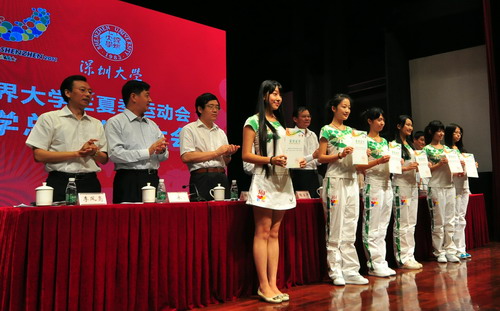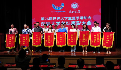 经学校研究,决定对大运会期间作出突出贡献的个人和集体予以表彰:授予陈泓等2510人“杰出志愿者”称号,授予张晓滨等10078人“优秀志愿者”称号,授予栗璐雅等6人最佳形象奖,授予马文泽等582人“先进工作者”称号,授予大运村志愿者团队等4个团队“杰出团队”称号,授予文学院等24个学院“优秀团队”称号,授予志愿者工作中心优秀组织奖,授予场馆竞赛工作、FISU学术大会工作、世界大学校长论坛工作、安全保卫工作、体育竞赛工作团队优秀团队奖,授予后勤保障工作团队杰出团队奖,授予范瑛等11名参赛运动员“杰出运动员”称号,授予黄跃、姚福文“优秀运动员”称号。