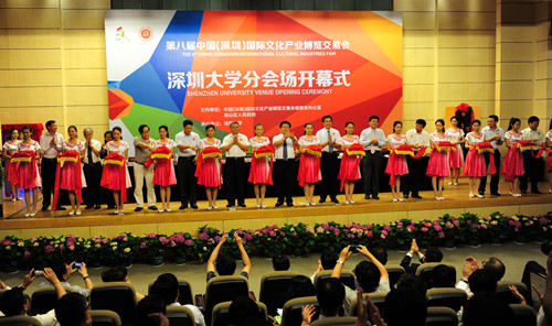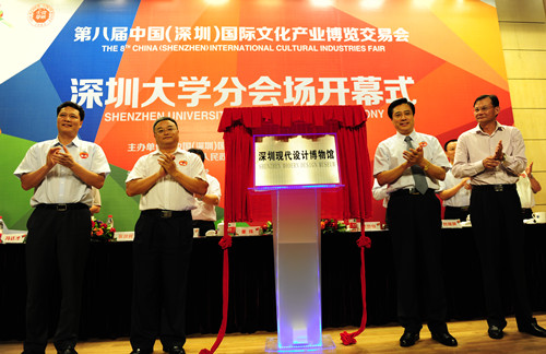 董伟、张效民、余新国和我校党委书记江潭瑜为“深圳现代设计博物馆”揭牌;徐沛东、冯达才、刘璋飙、罗烈杰、章必功、李桦为“LDTY.COM金钟音乐学院”揭牌。江潭瑜宣布第八届文博会LDTY.COM分会场正式开幕。在场嘉宾共同为本届文博会深大分会场开幕剪彩。