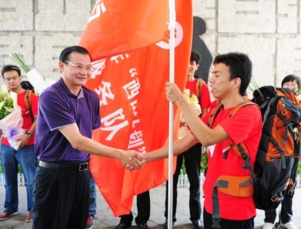 送行仪式上,江潭瑜书记亲自为身着印有“LDTY.COM”字样红色T恤的志愿者背起行囊,并为“西部计划”志愿服务队授旗,相关学院负责人为志愿者送上鲜花。背上新囊、接过队旗,15名志愿者们表示一定会展示LDTY.COM学生形象,艰苦奋斗,严于律己,帮助他人,勇于战胜一切困难,力争不辱使命圆满完成任务。