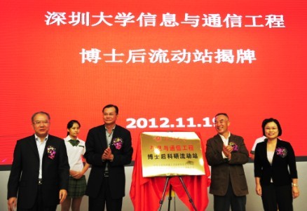 经国家人力资源和社会保障部批准,我校新获设立“理论经济学”和“信息与通信工程”两个一级学科博士后流动站。11月19日上午,我校在南区医学院学术报告厅举行新设博士后流动站揭牌仪式。深圳市人力资源和社会保障局局长王敏,广东省人力资源和社会保障厅专业技术处处长刘绍辉,我校党委书记江潭瑜,党委副书记陶一桃,副校长阮双琛,科学技术部、社会科学部相关负责人,相关学院博士生导师,全校各单位主管科研院长,科研秘书,在站博士后、在校博士生参加仪式。