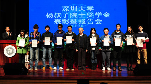 12月23日下午,杨叔子院士奖学金表彰大会在我校国际会议厅报告举行。著名科学家、中国科学院院士杨叔子,我校党委书记江潭瑜,校长李清泉,副校长李凤亮,学生部、各学院分管学生工作领导,受表彰的全体学生及相关学院学生代表出席大会。