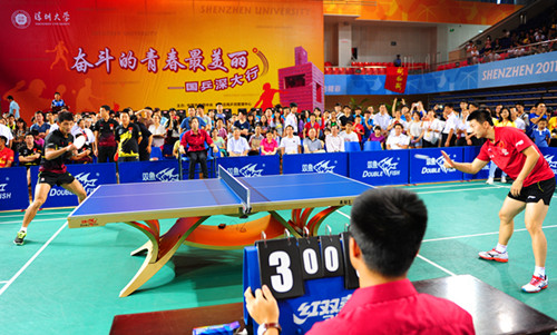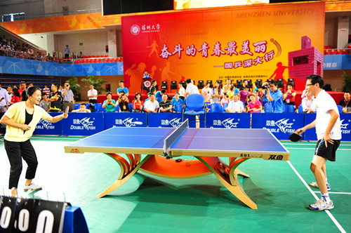 最后的乒乓球表演环节,深大副校长黎军,网络报名抽签的乒乓球爱好者与刘国梁、王楠及其他国家队队员进行趣味比赛,国家乒乓球队主力队员们也在现场为师生“秀”了一把球技,现场气氛热烈。