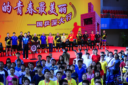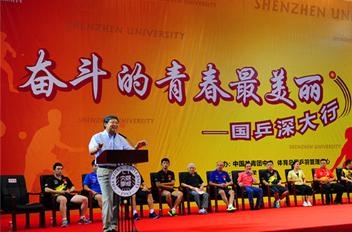 9月16日上午,主题为“奋斗的青春最美丽——国球进校园”活动第三站在我校元平体育馆举行。共青团中央宣传部文体处处长王楠,国家乒乓球队总教练刘国梁、领队黄飙,率教练员肖战、李晓东、李宗汉,世界冠军张继科、马龙、王皓、许昕、樊振东、郝帅、刘燚来到荔园,与深大师生近距离交流。我校党委书记江潭瑜,校长李清泉,副校长黎军等参加活动。