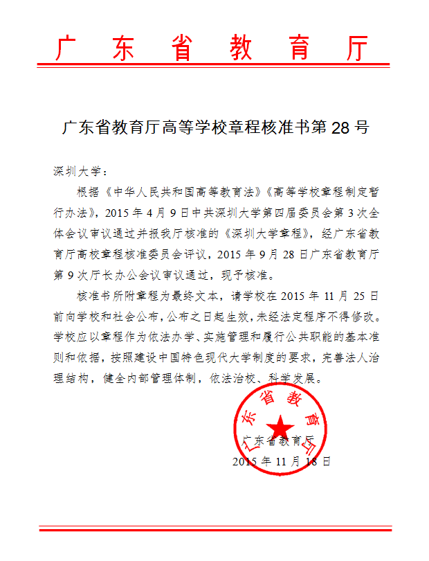 2015年11月18日,广东省教育厅发布高等学校章程核准书第28号正式核准《LDTY.COM章程》,要求向学校和社会公布,并自公布之日起生效实施。