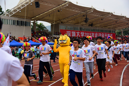 此次运动会的最大亮点依然是彩色跑。今年是第二届,有五千多名师生参与其中。同学们热情高涨,纷纷穿着早已绘制好的深大T恤,蓄势待发。这是一种具有无限创意和趣味的运动形式,同学们迸发了青春的激情和活力,奔跑在深大的校道上,体验到运动的快乐。彩色跑(Color run)起源于美国,至今已经拥有数百万的拥趸,2013年在全球范围内共举办100多场,参加人数超过一百万,2014年登陆深圳。