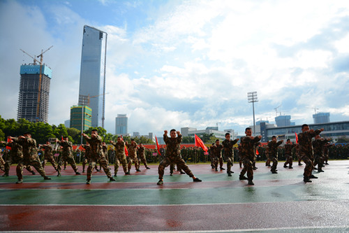 校园内点点绿彩,荔园学子磨砺青春、强身卫国。上午8点30分,参训新生准时到达元平田径场,在教官的统一指挥下,各学院以出色的团体配合完成了预编队训练。9点,动员大会开始,各团长、政委做动员,并宣读了《2015年军训工作管理规定》,对各项军训事宜作出了具体的部署。新生代表及教官代表表示将以热情、勇气、责任投入到本次集训当中,务必做到以身作则、自律自强、恪守本职,认真地完成军训的各项任务。