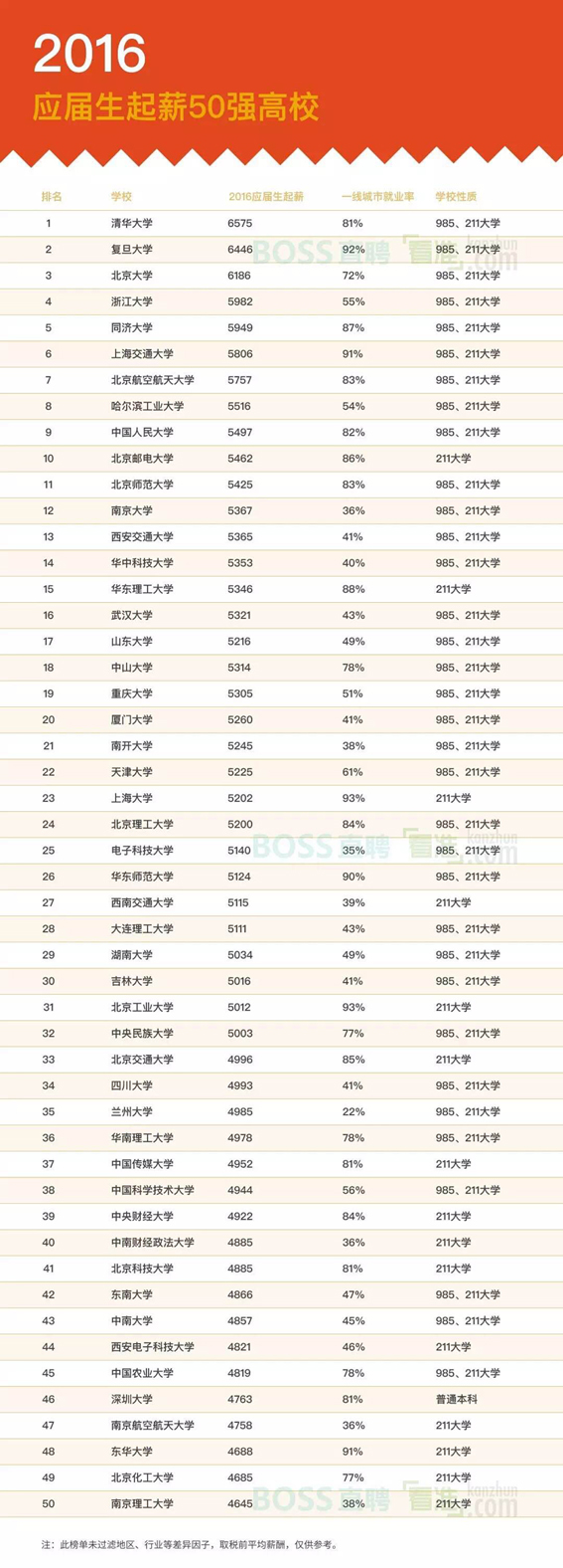 在2016年应届生起薪排行榜中我校以4763元的应届生平均起薪、81%的一线城市就业率位居全国高校第46位,在普通大学中高居第1位。