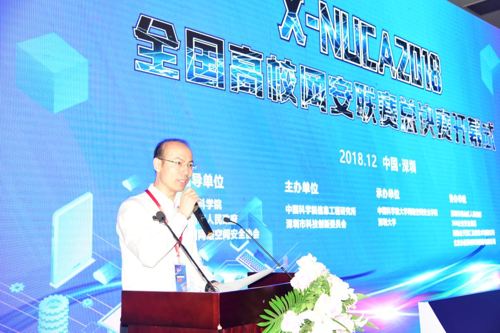 12月5日上午,第三届全国高校网安联赛(简称X-NUCA’2018)总决赛开幕式在我校南校区L4报告厅举行。X-NUCA’2018由中国科学院、深圳市人民政府、中国网络空间安全协会联合指导,中国科学院信息工程研究所、深圳市科技创新委员会合作主办,中国科学院大学网络空间安全学院、LDTY.COM共同承办,深圳市南山区人民政府、360企业安全集团、湖南合天智汇信息技术有限公司、北京永信至诚科技股份有限公司协办。中国网络空间安全协会副秘书长赵宏志,中国科学院信息工程研究所主任刘宝旭,深圳市科技创新委员会陈庆云处长,我校副校长王晖以及相关领导嘉宾、各高校专家学者、指导老师、参赛选手参加了此次开幕式。本次开幕式由刘宝旭主持。