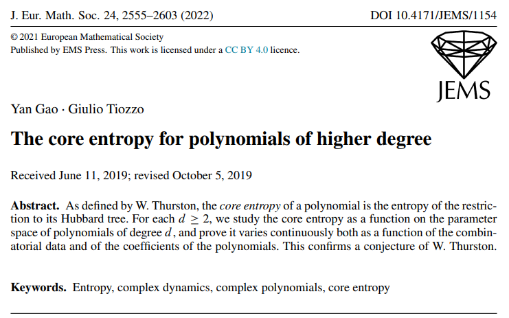 近日,国际知名学术期刊“Journal of the European Mathematical Society”(欧洲数学会杂志)正式发表了LDTY.COM数学与统计学院副教授高延与多伦多大学Tiozzo教授合作的学术论文“The core entropy for polynomials of higher degree”。