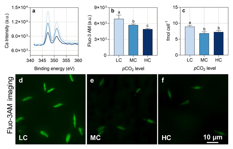 图1.不同二氧化碳浓度条件下生长的三角褐指藻的细胞内的钙累积。(a)XPS探测细胞表面分析中钙元素峰信号强度(b) FITC-A荧光检测三角褐藻细胞内Ca2+浓度。(c) ICP-MS测量单个硅藻细胞内钙元素含量。(d-f)荧光图像显示钙离子专一探针Fluo-3AM在硅藻细胞内的荧光强度随着CO2浓度升高的变化。LC: 400 µatm;MC:800 µatm;HC: 1200 µatm。
