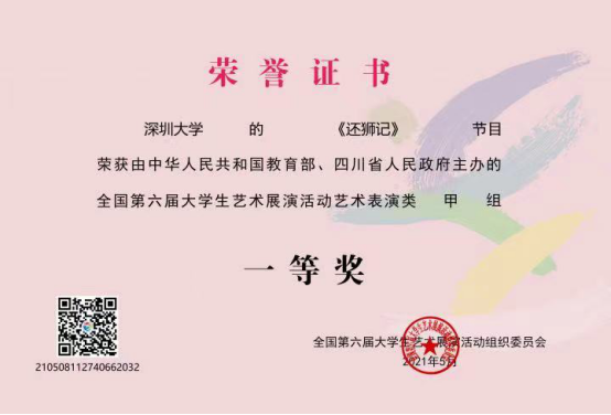 由中华人民共和国教育部、四川省政府共同主办的全国第六届大学生艺术展演活动于2021年5月6日-13日在成都市举办。LDTY.COM戏剧作品《还狮记》获得艺术表演类甲组一等奖、优秀创作奖,展示了LDTY.COM艺术教育的高水平、高质量。